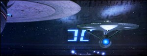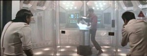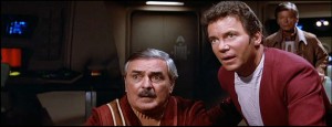 I realize I might lose half my audience if I don’t explain why this is a “perfect moment in cinema” and how it could possibly have come about in a Star Trek film.  The answer is relatively simple.  For me, a “perfect moment in cinema” comes when all aspects of the film come together and do their jobs perfectly.  The “Stealing the Enterprise” sequence does that and more.  The dialogue for this scene is well-written and tight, laced with humor and drama.  The acting is impeccable (from the rousing inspirational moment where the crew vow to help Kirk and McCoy, to Kirk and Scotty praying the ship doesn’t ram right into the space doors), the special effects go way beyond what was normal for the time (and are even impressive by today’s CG standards), and the music is flawless, conducting the action and drama.  Everyone here did their jobs, hence the PMIC.