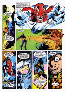 ‘Cause, see, one of the first seeds that Thorpe and Davis planted was a mindbending matryoshka doll of alternate universes that made the Crisis on Infinite Earths look like a child’s tea party. It is quickly made apparent that Captain Britain and Jackdaw aren’t on our Earth, but instead on an alternate but similar world, one of many whose development is being interfered with, for the good of the Omniverse, by Majestrix Opal Luna Saturnyne and her Avant Guard. (This idea was a seed that would bear far-reaching fruit: the designation by which the “main” Marvel Universe Earth was known to Saturnyne and her bunch was “Earth-616”, and that, along with the various other Earth designations, has become the standard system for describing the various alternate realities of Marvel’s multiverse.) Thorpe’s ten-month run as writer also introduced the Crazy Gang, a hilarious bunch of Alice in Wonderland-inspired goons with extra playing-card flavor, and a loony MP called Sir Jim Jaspers.