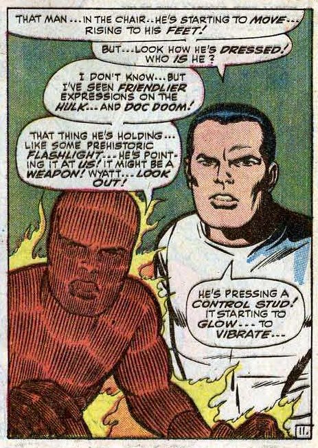 Let me be clear, even after this artistic watershed, many of the criticisms in my earlier column were still valid. The characters were still prone to shouting the obvious at each other (witness Stan gamely trying to compensate for what he clearly thinks is inadequate visual storytelling in the panel to the left). The much-vaunted interpersonal drama was often forced. For example, Johnny “Human Torch” Storm and the Inhuman named Crystal seem to know each other for all of fifteen minutes before declaring their undying love for each other, just as an impenetrable barrier separates them apparently forever. Johnny and Crystal spend the next year thinking of nothing but each other, with Johnny driven to all kinds of irrational behavior by his all-consuming passion. That’s the kind of thing I mean by “brute-force storytelling”. Also, Stan Lee still displayed an astounding ability to reduce any scientific concept imaginable—magnetism, thermodynamics, nuclear physics, gravity, soundwaves, you name it—to purest phlebotinum.