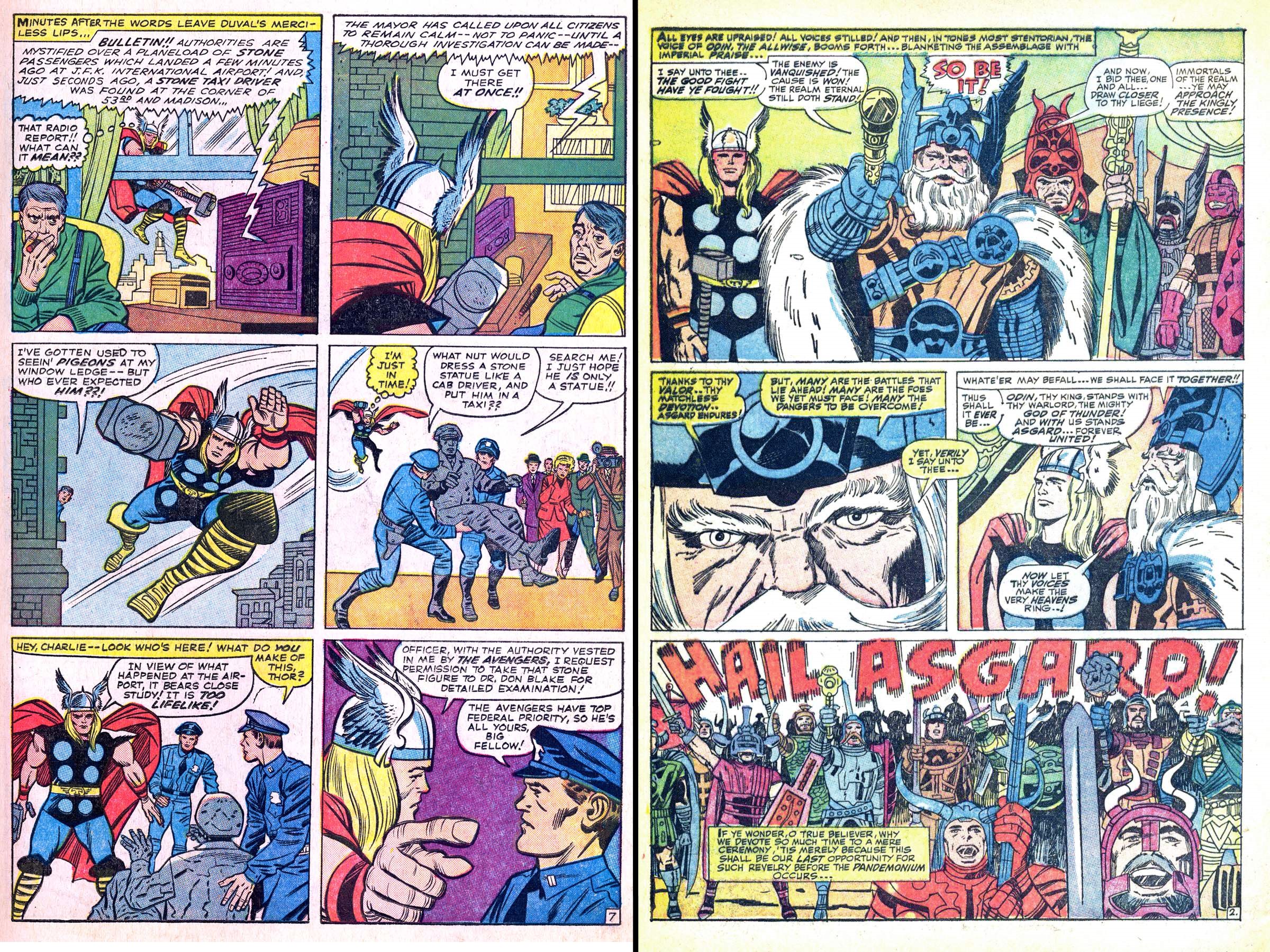 A side-by-side comparison. On the left: From Journey into Mystery #107, August 1964, by Stan Lee, Jack Kirby and Chic Stone. On the right: From Thor #140, May 1967, by Stan Lee, Jack Kirby and Vince Colletta. Click to enlarge. (Images © Marvel)