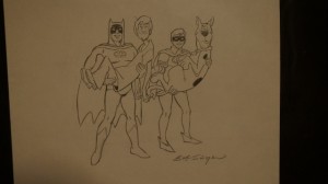 B.S.: When Shaggy was first designed, (draws in the original goatee) they drew it like that and you’ll see it in cartoons, in early Scooby‘s, maybe even the whole first season or a half a season. The trouble with this one is, (referring to the left goatee) what color is down here? They used to take flesh and add flesh down into the beard and that didn’t look right. So what they did was, they came up with 7 hairs, 1-2-3-4-5-6-7, and I didn’t draw it, but there’s an add in to his jaw to control when you animate the character, you want to keep control of where those hairs go. Anyway, that was the big change with Shaggy. The rest of the characters didn’t change. But in all, it’s very important cause there is alot of money tied up in merchandising. In many cases, the characters would change from the first show, to the second, third seasons and would get better and better, just like Mickey Mouse changed through the years. Bugs Bunny went through a big change. How about Tom and Jerry? Tom used to have fur around his body. So, now you think wow those are such wonderful, growing characters… they just weren’t come up with overnight. It took in some cases years.
