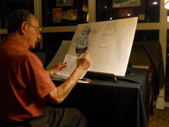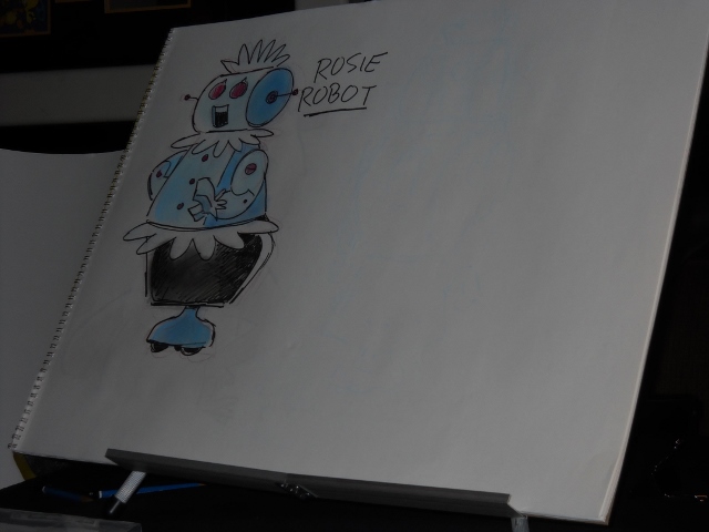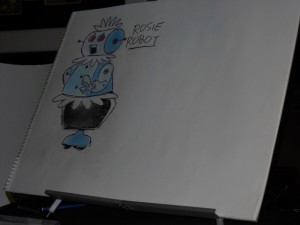 TV cartoons, for little money, and created a whole new style which wasn’t only cheap and inexpensive, it actually became a style. Followed by U.P.A. Pictures and others and commercials were made in Hollywood, reusing that flat style, Limited Animation they called it, or Planned Animation they preferred to call it. Anyway, a very important part of making cartoons is character design and that’s what I’m going to talk about a little bit right now. I’m sure you’ll all recognize these characters that I’m going to show you. (opens his sketch pad) There. That is Rosy the Robot. I made some preliminary sketches, so I’d get them right- ha. This is from the first season, but Rosy didn’t look like that the first season- she looked different. The funny thing when they make cartoons, cartoons tend to change year to year and better and better, with the designs of the characters. There’s a famous one with Shaggy from Scooby Doo that I’ll show you later, but anyway here is what Rosy looked like when she was first designed. (Starts to sketch the original Rosy)