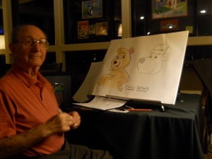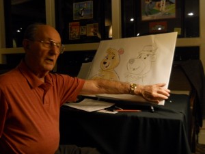 Cindy Bear. Isn’t she cute? When she was first designed, what did they do? The made her into- (indicating to finished character) see this is a very feeling, attractive bear (starting to draw demo concept). They gave her a little hat, about this size. In fact, the first person to draw this, they used a Yogi Bear head. (laugh) Which is sorta weird… (group agrees) cause you see this, this is a real female. Also, you can take almost any character, you put eyelashes on it and lipstick, and you got a girl (Laugh. He adds them to the sketch ). That makes them a girl, officer.