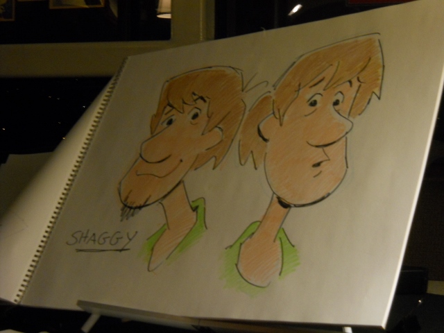 B.S.: With Sqiddly Diddly, you’d be surprised how different he looked, but the character’s the same. (sketches demo) In fact, they didn’t put the sailor hat on there, just a little hat like this… And it had polka dots. Still had the cute eyes. One of my secrets in drawing is I don’t make 2 eyebrows the same. I always change them. One is this and one is that. (laugh) I get better expressions out of them. Sqiddly Diddly. Here’s another one… (flips the page) Shaggy. What’s missing from here?