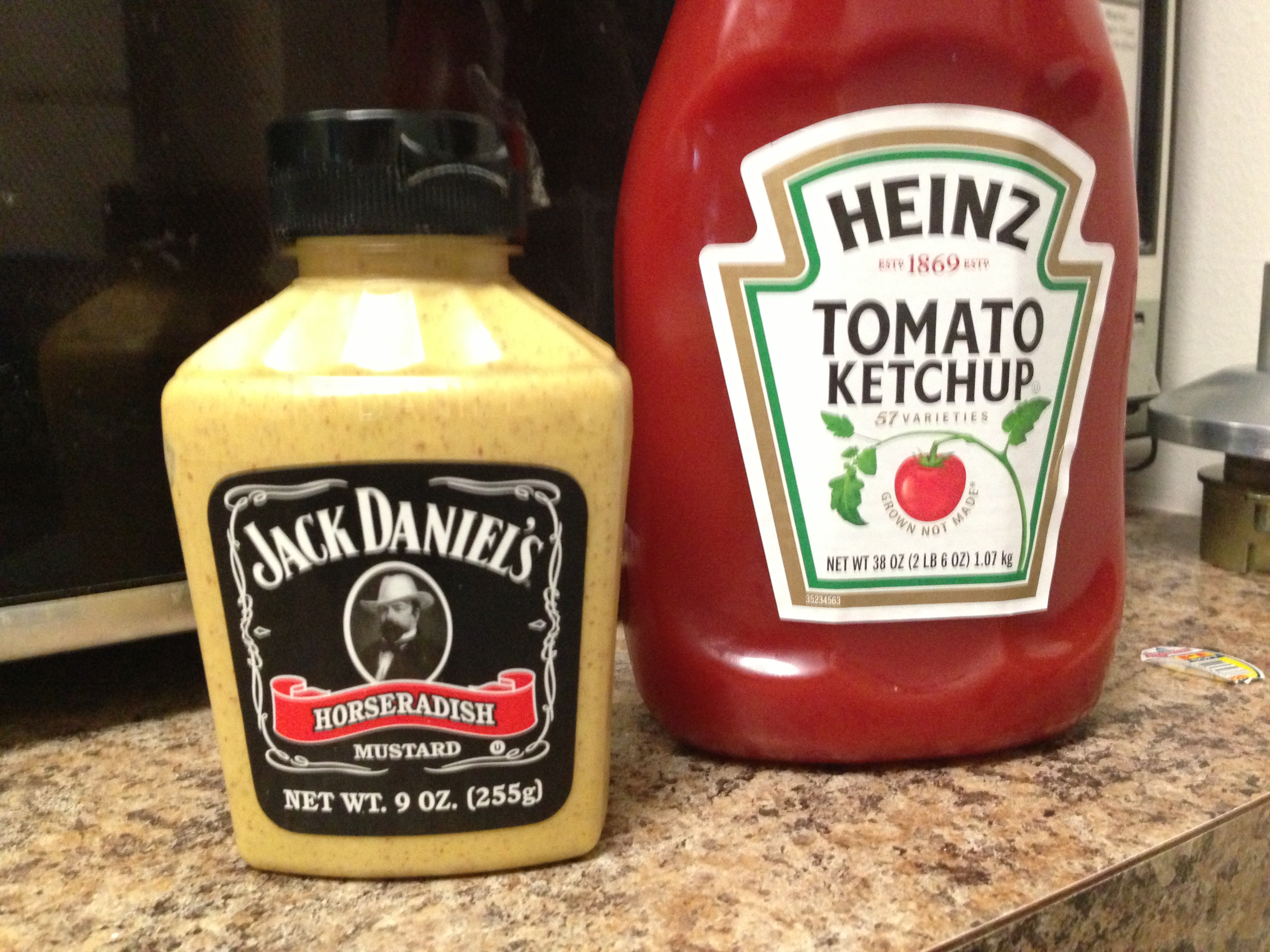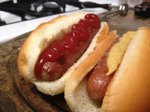 Usually I eat my dogs one of two ways. I either put on some beanless Hormel chili, or I slather on some ketchup, mustard and relish. To give the dogs sufficient room to shine on their own, I decided to try one dog with ketchup alone, and one with mustard (my mustard of choice being of the Jack Daniels horseradish variety).